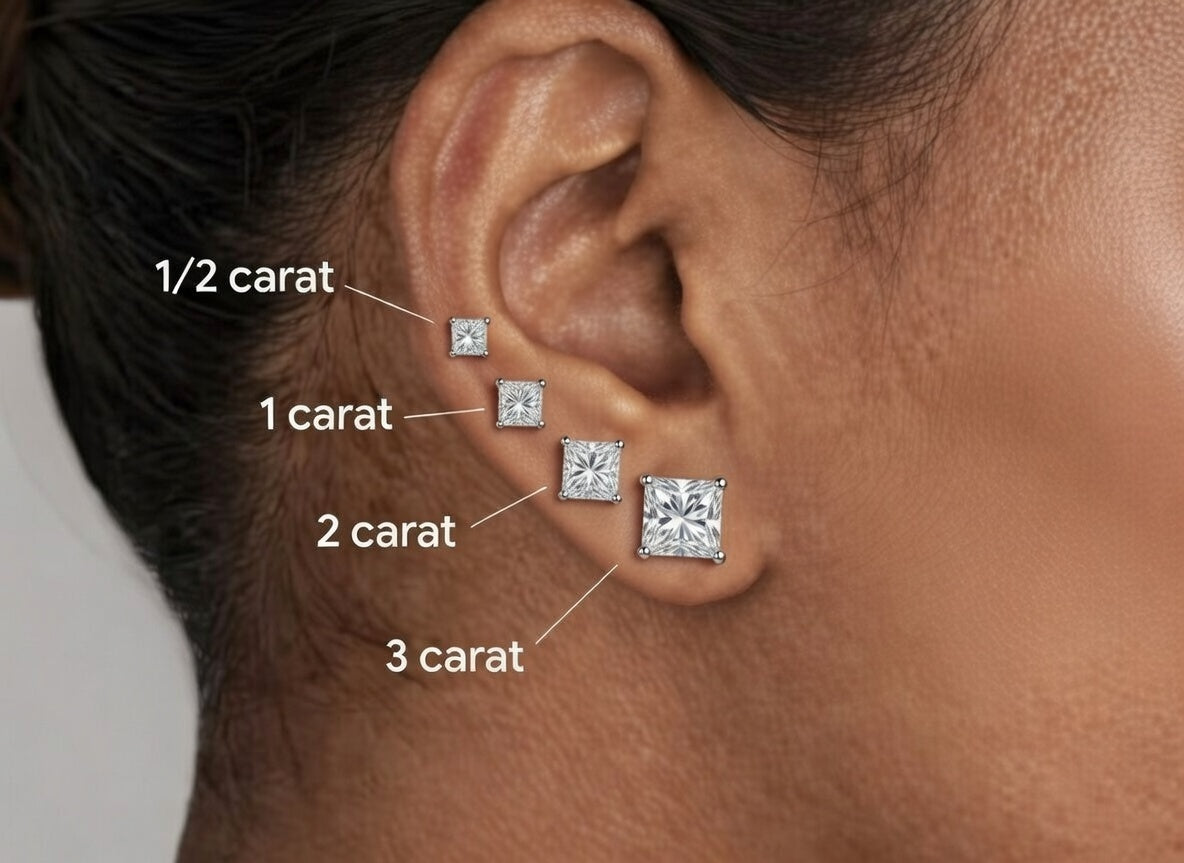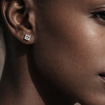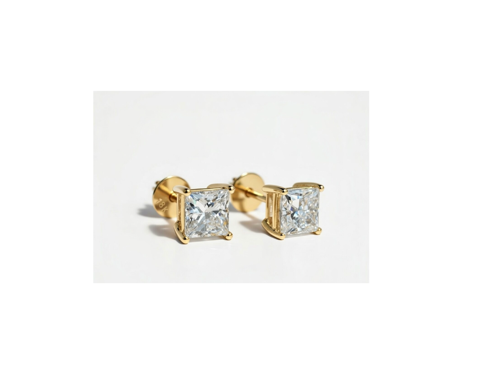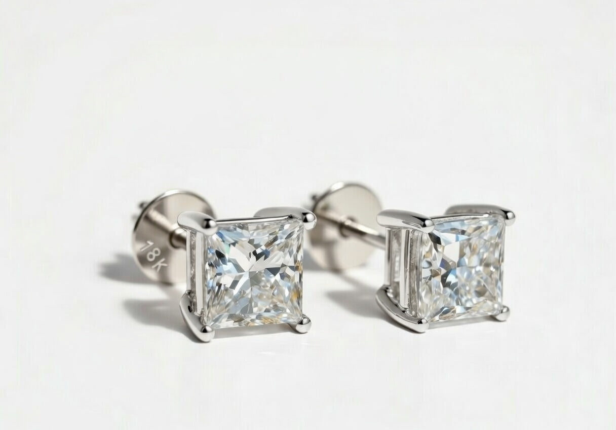 Princess-cut diamond studs are square-shaped diamond earrings with pointed corners and brilliant-cut facets that maximize sparkle. They offer a modern, geometric alternative to round diamonds while maintaining exceptional light performance — making them a sleek, elegant choice for everyday wear or special occasions.