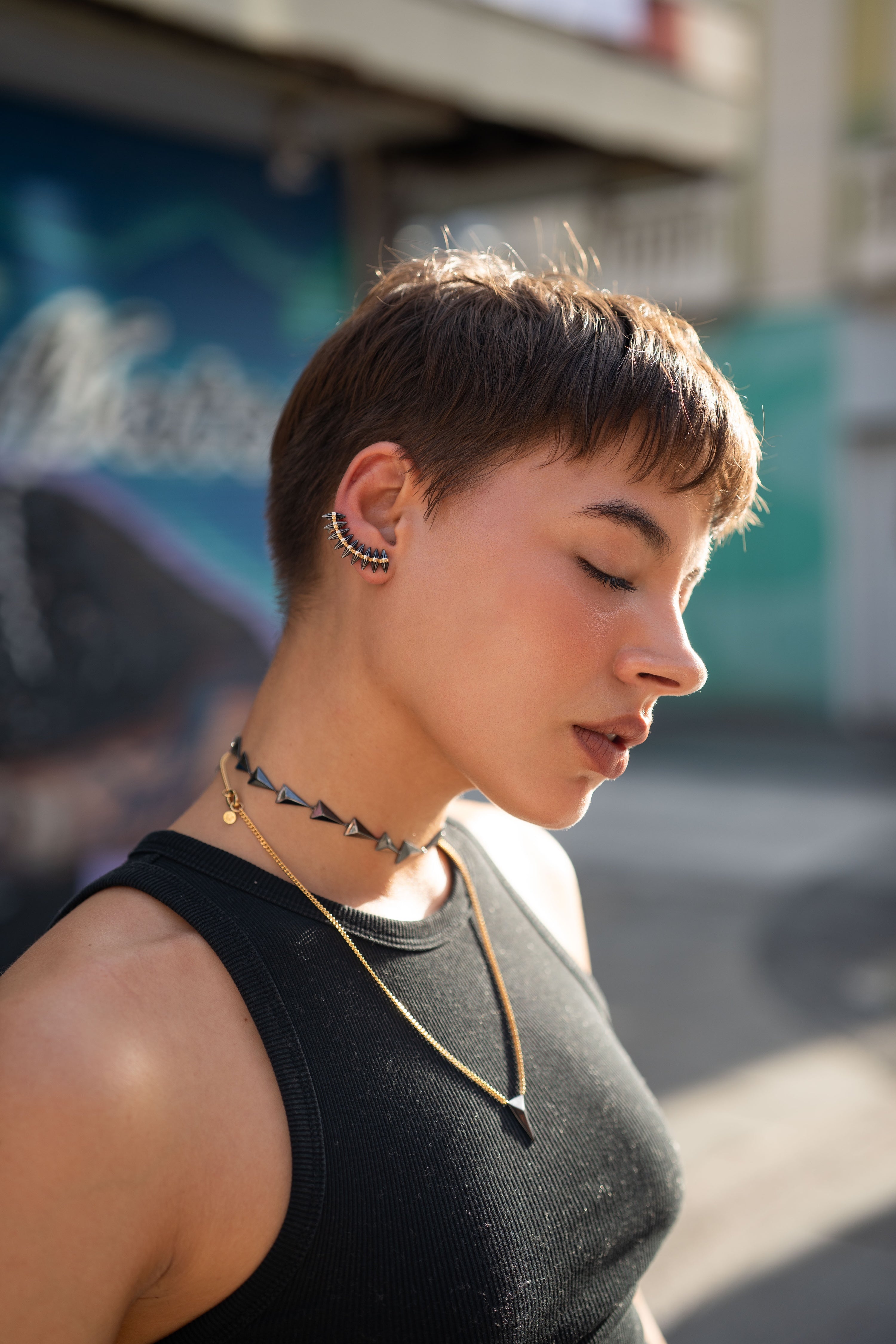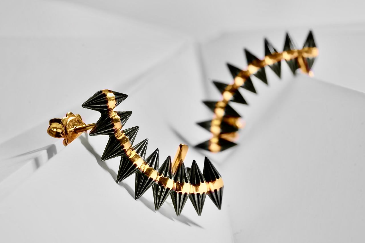 Inspired by the legendary Queen Scheherazade, who used wit and storytelling to save lives, these earrings celebrate feminine intelligence and strength. Crafted in recycled solid 14K Gold and edgy Rhodium-plated spikes, they’re a modern tribute to power, elegance, and resilience.